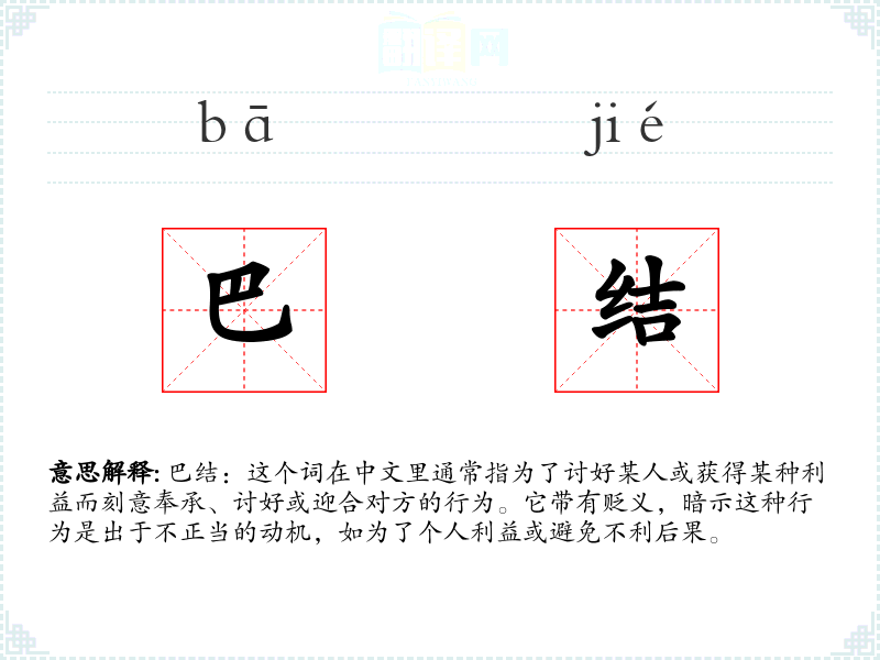 巴结:这个词在中文里通常指为了讨好某人或获得某种利益而刻意奉承、讨好或迎合对方的行为。它带有贬义,暗示这种行为是出于不正当的动机,如为了个人利益或避免不利后果。