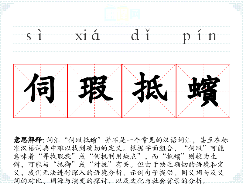 因此,对于“伺瑕抵蠙”这一词汇,我们只能基于字面意义进行有限的分析,而无法进行全面的深入学习和分析。在语言学习和表达中,遇到此类生僻词汇时,重要的是理解其在特定语境中的具体含义,或者在无法确定含义时,避免使用以免造成误解。