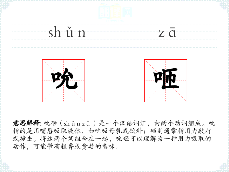 吮字最早见于《说文解字》,原意为吸吮。砸字则较晚出现,主要用于描述敲打或撞击的动作。吮砸作为一个组合词,可能是现代汉语中较为少见的用法,其组合可能是为了强调动作的力度和方式。