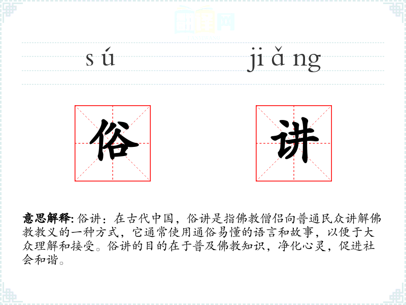 - 口语:在现代口语中,俗讲可以泛指任何通俗易懂的讲解或演讲,不限于**内容。