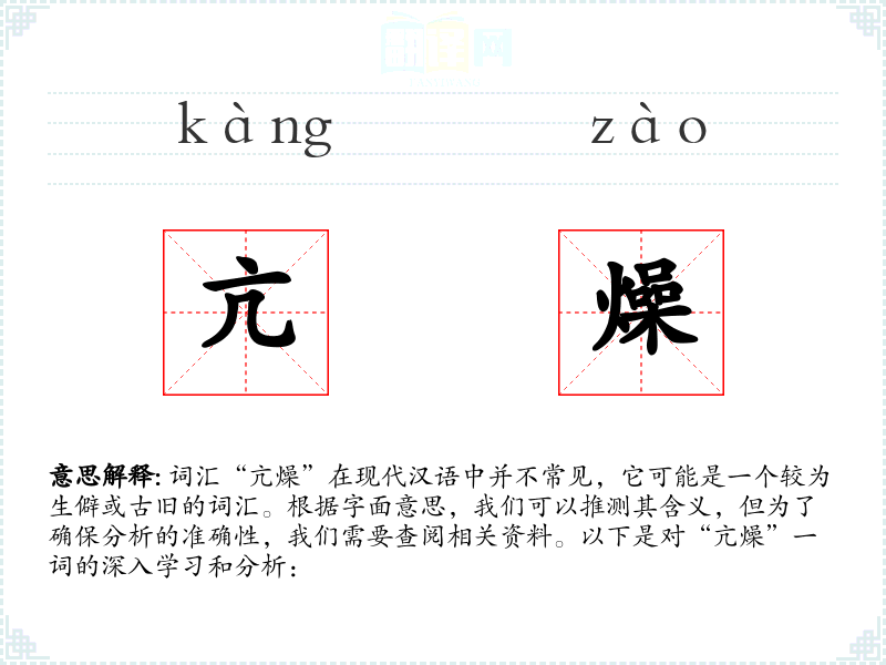 词汇“亢燥”在现代汉语中并不常见,它可能是一个较为生僻或古旧的词汇。根据字面意思,我们可以推测其含义,但为了确保分析的准确性,我们需要查阅相关资料。以下是对“亢燥”一词的深入学习和分析: