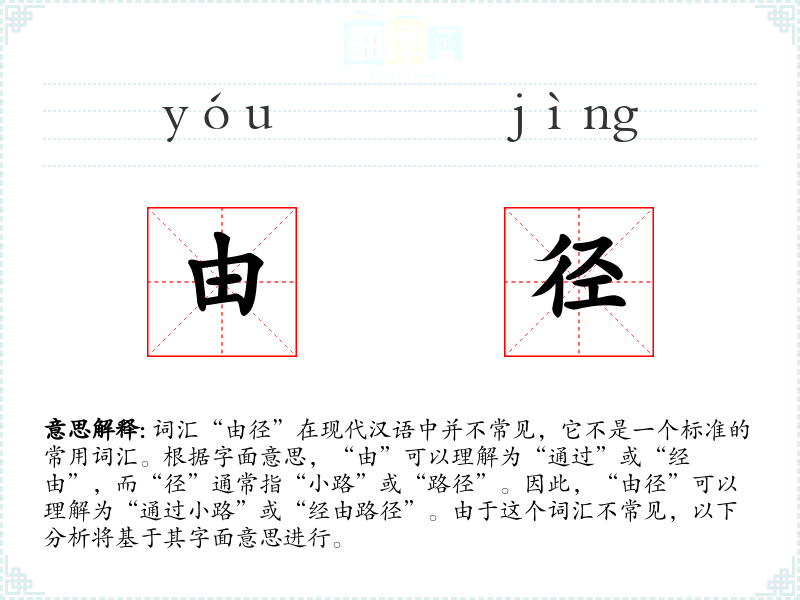 词汇“由径”在现代汉语中并不常见,它不是一个标准的常用词汇。根据字面意思,“由”可以理解为“通过”或“经由”,而“径”通常指“小路”或“路径”。因此,“由径”可以理解为“通过小路”或“经由路径”。由于这个词汇不常见,以下分析将基于其字面意思进行。