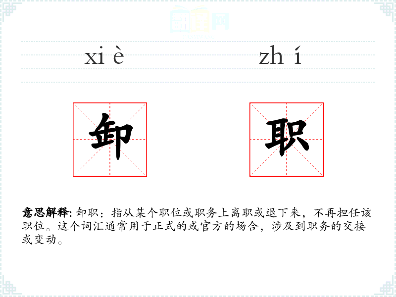 卸职:指从某个职位或职务上离职或退下来,不再担任该职位。这个词汇通常用于正式的或官方的场合,涉及到职务的交接或变动。