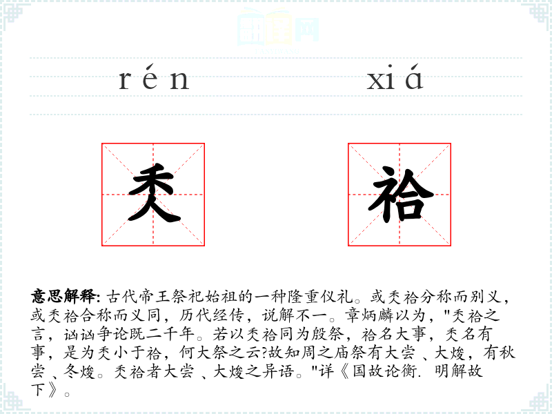 1.古代帝王祭祀始祖的一种隆重仪礼。或秂祫分称而别义,或秂祫合称而义同,历代经传,说解不一。章炳麟以为,"秂祫之言,讻讻争论既二千年。若以秂祫同为殷祭,祫名大事,秂名有事,是为秂小于祫,何大祭之云?故知周之庙祭有大尝﹑大焌,有秋尝﹑冬焌。秂祫者大尝﹑大焌之异语。"详《国故论衡.明解故下》。
