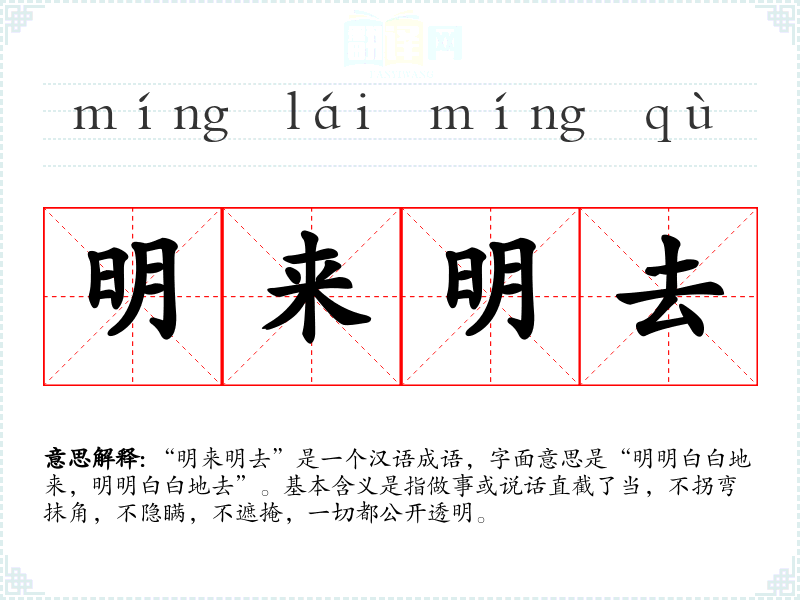 在文学作品中,“明来明去”常用来形容人物性格直率,行为光明磊落。在口语中,人们常用这个成语来形容某人做事干脆利落,不拖泥带水。在专业领域,如法律或商业谈判中,这个成语可以用来强调信息的透明度和交易的公正性。