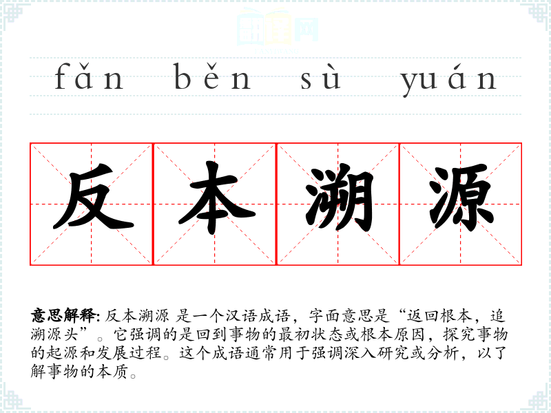 反本溯源 是一个汉语成语,字面意思是“返回根本,追溯源头”。它强调的是回到事物的最初状态或根本原因,探究事物的起源和发展过程。这个成语通常用于强调深入研究或分析,以了解事物的本质。
