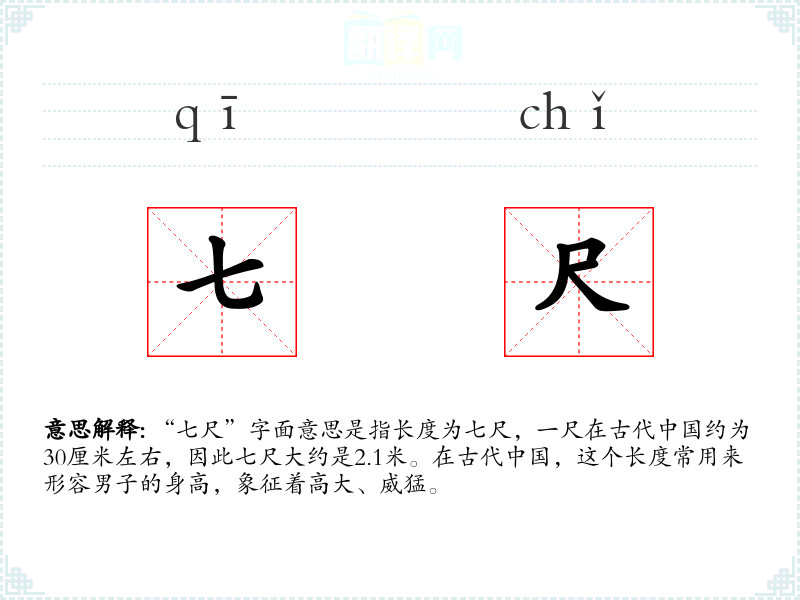 “七尺”字面意思是指长度为七尺,一尺在古代约为30厘米左右,因此七尺大约是2.1米。在古代,这个长度常用来形容男子的身高,象征着高大、威猛。