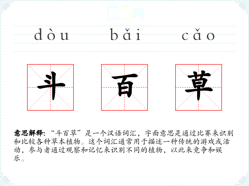 “斗百草”是一个汉语词汇,字面意思是通过比赛来识别和比较各种草本植物。这个词汇通常用于描述一种传统的游戏或活动,参与者通过观察和记忆来识别不同的植物,以此来竞争和娱乐。