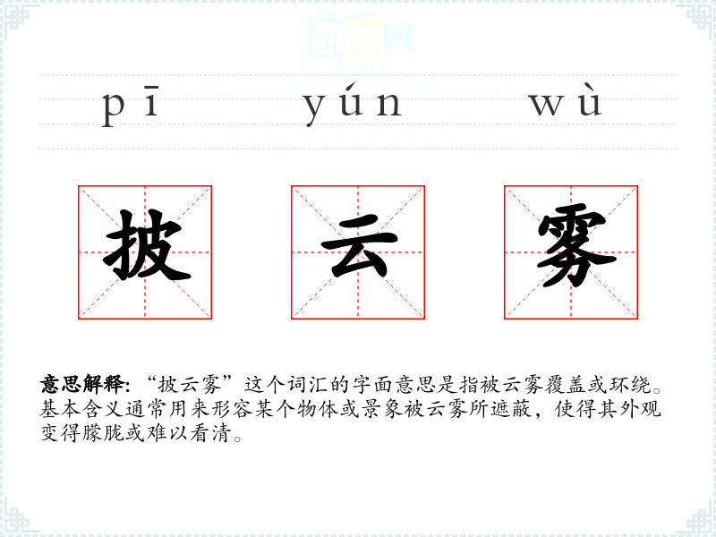 “披云雾”这个词汇的字面意思是指被云雾覆盖或环绕。基本含义通常用来形容某个物体或景象被云雾所遮蔽,使得其外观变得朦胧或难以看清。