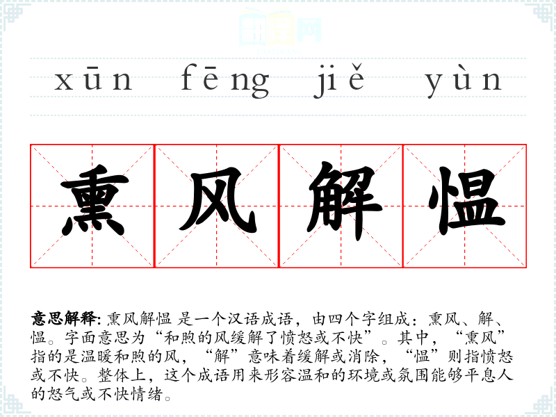 熏风解愠 是一个汉语成语,由四个字组成:熏风、解、愠。字面意思为“和煦的风缓解了愤怒或不快”。其中,“熏风”指的是温暖和煦的风,“解”意味着缓解或消除,“愠”则指愤怒或不快。整体上,这个成语用来形容温和的环境或氛围能够平息人的怒气或不快情绪。