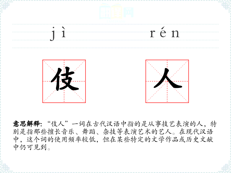 - 专业领域:在艺术史或表演艺术的研究中,“伎人”可能会被用来指代特定历史时期的表演者。