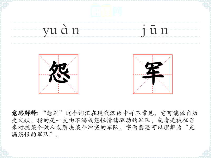 - 反义词:正规军、政府军(这些词汇指的是受官方指挥的军队,与“怨军”形成对比)