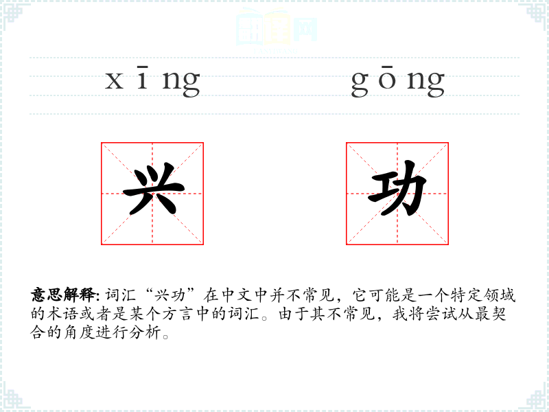 词汇“兴功”在中文中并不常见,它可能是一个特定领域的术语或者是某个方言中的词汇。由于其不常见,我将尝试从最契合的角度进行分析。