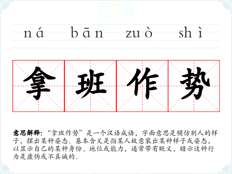 “拿班作势”是一个汉语成语,字面意思是模仿别人的样子,摆出某种姿态。基本含义是指某人故意装出某种样子或姿态,以显示自己的某种身份、地位或能力,通常带有贬义,暗示这种行为是虚伪或不真诚的。
