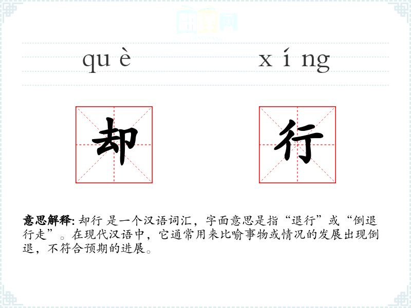 在英语中,却行 可以对应到 "retrogress" 或 "backslide",这些词汇同样用来描述倒退或逆转的情况。