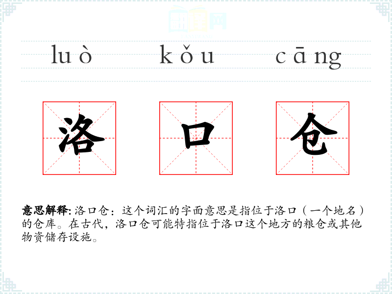 总结:洛口仓作为一个历史词汇,不仅代表了古代的仓储设施,还承载了丰富的文化和历史信息。 反思:了解这样的词汇有助于我们更好地理解古代社会和经济结构,对于语言学*和文化传承具有重要意义。