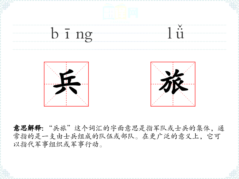 “兵旅”这个词汇的字面意思是指军队或士兵的集体,通常指的是一支由士兵组成的队伍或部队。在更广泛的意义上,它可以指代军事组织或军事行动。