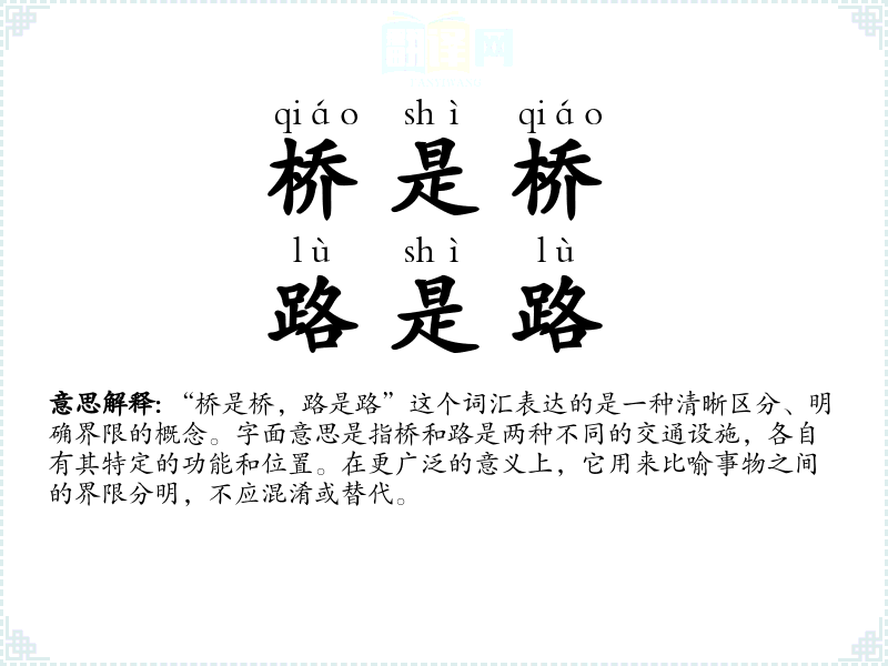 “桥是桥,路是路”这个词汇表达的是一种清晰区分、明确界限的概念。字面意思是指桥和路是两种不同的交通设施,各自有其特定的功能和位置。在更广泛的意义上,它用来比喻事物之间的界限分明,不应混淆或替代。