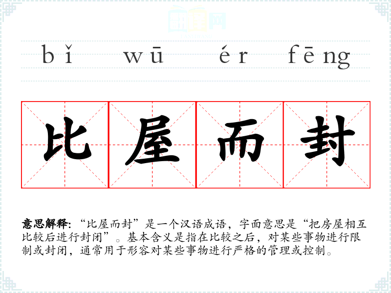 “比屋而封”是一个汉语成语,字面意思是“把房屋相互比较后进行封闭”。基本含义是指在比较之后,对某些事物进行限制或封闭,通常用于形容对某些事物进行严格的管理或控制。