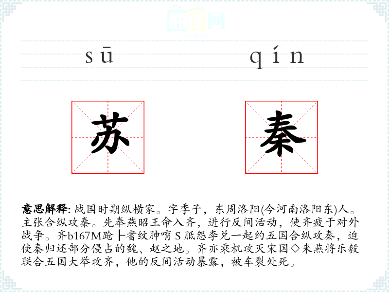 1.战国时期纵横家。字季子,东周洛阳(今河南洛阳东)人。主张合纵攻秦。先奉燕昭王命入齐,进行反间活动,使齐疲于对外战争。齐b167M跄┠耆纹胂唷S胝怨李兑一起约五国合纵攻秦,迫使秦归还部分侵占的魏、赵之地。齐亦乘机攻灭宋国◇来燕将乐毅联合五国大举攻齐,他的反间活动暴露,被车裂处死。