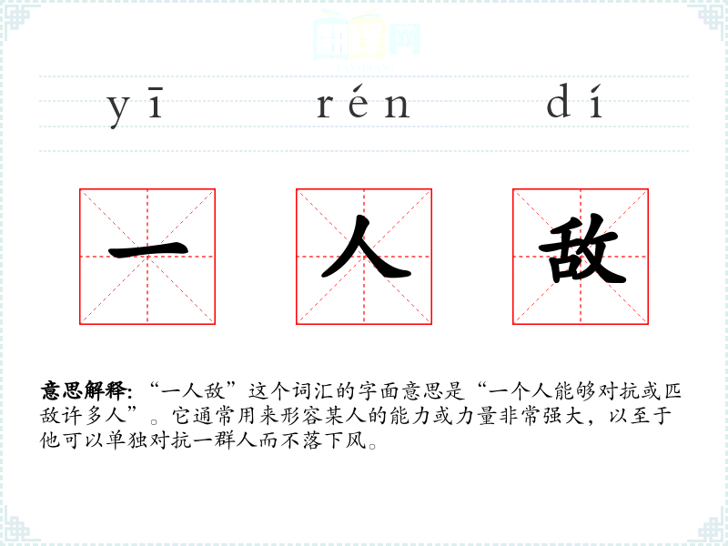“一人敌”这个词汇的字面意思是“一个人能够对抗或匹敌许多人”。它通常用来形容某人的能力或力量非常强大,以至于他可以单独对抗一群人而不落下风。