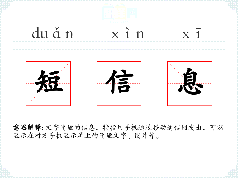 文字简短的信息,特指用手机通过移动通信网发出,可以显示在对方手机显示屏上的简短文字、图片等。