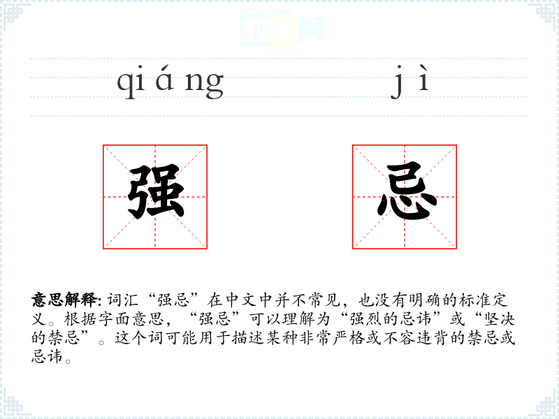 - 字面意思:强忌由“强”和“忌”两个字组成。“强”表示强烈、坚决,“忌”表示忌讳、禁忌。