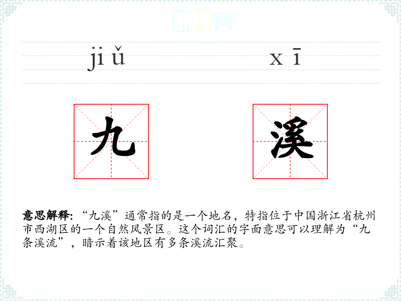 “九溪”通常指的是一个地名,特指位于**浙江省杭州市西湖区的一个自然风景区。这个词汇的字面意思可以理解为“九条溪流”,暗示着该地区有多条溪流汇聚。