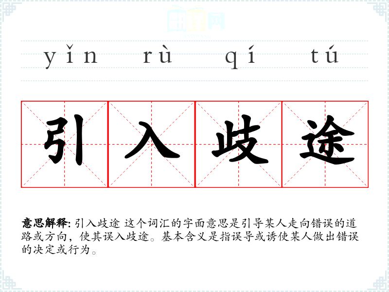 引入歧途 这个词汇的字面意思是引导某人走向错误的道路或方向,使其误入歧途。基本含义是指误导或诱使某人做出错误的决定或行为。