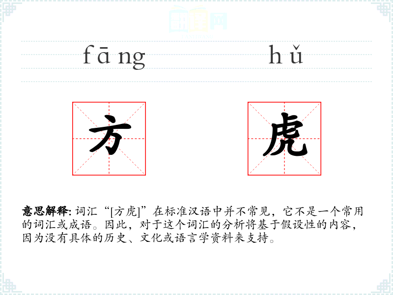 词汇“[方虎]”在标准汉语中并不常见,它不是一个常用的词汇或成语。因此,对于这个词汇的分析将基于假设性的内容,因为没有具体的历史、文化或语言学资料来支持。