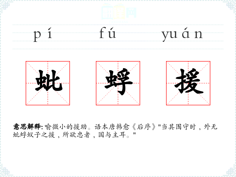 喻微小的援助。语本唐韩愈《后序》"当其围守时﹐外无蚍蜉蚁子之援﹐所欲忠者﹐国与主耳。"