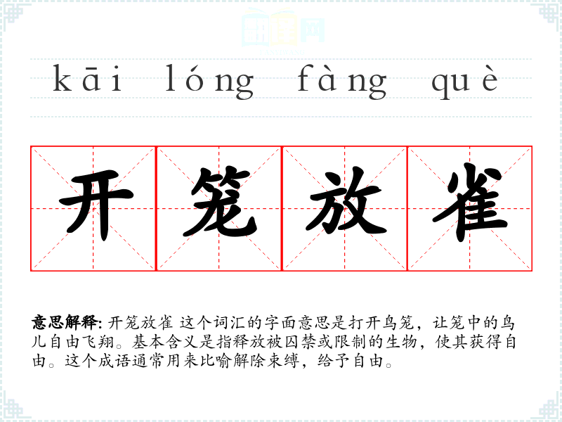 开笼放雀 这个词汇的字面意思是打开鸟笼,让笼中的鸟儿自由飞翔。基本含义是指释放被囚禁或限制的生物,使其获得自由。这个成语通常用来比喻解除束缚,给予自由。