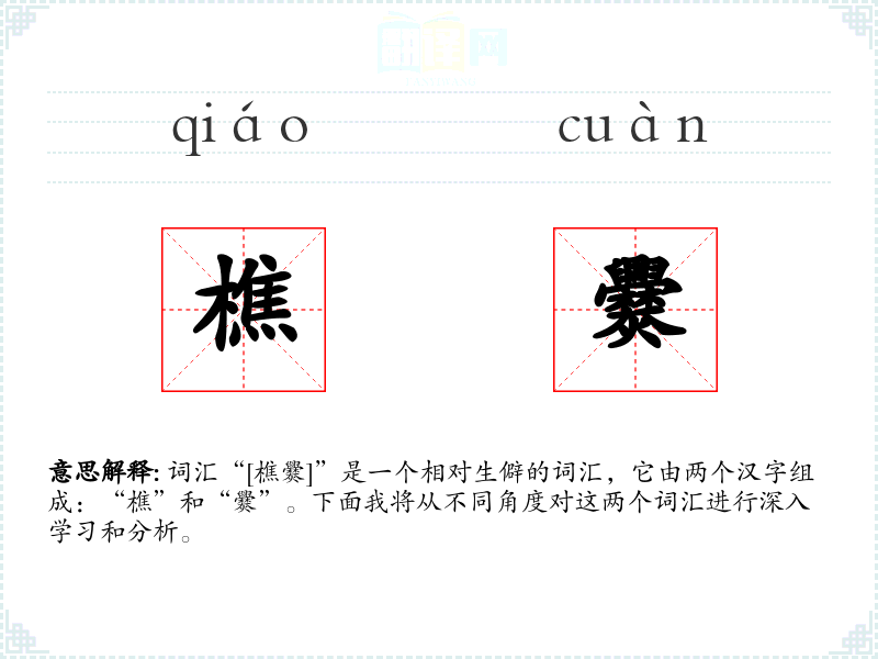 词汇“[樵爨]”是一个相对生僻的词汇,它由两个汉字组成:“樵”和“爨”。下面我将从不同角度对这两个词汇进行深入学*和分析。