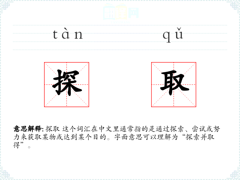 “探取”由“探”和“取”两个字组成,“探”字古已有之,意为深入调查或摸索;“取”字则表示获得或采取。这两个字结合,形成了“探取”这一复合词,其含义也随之确定。