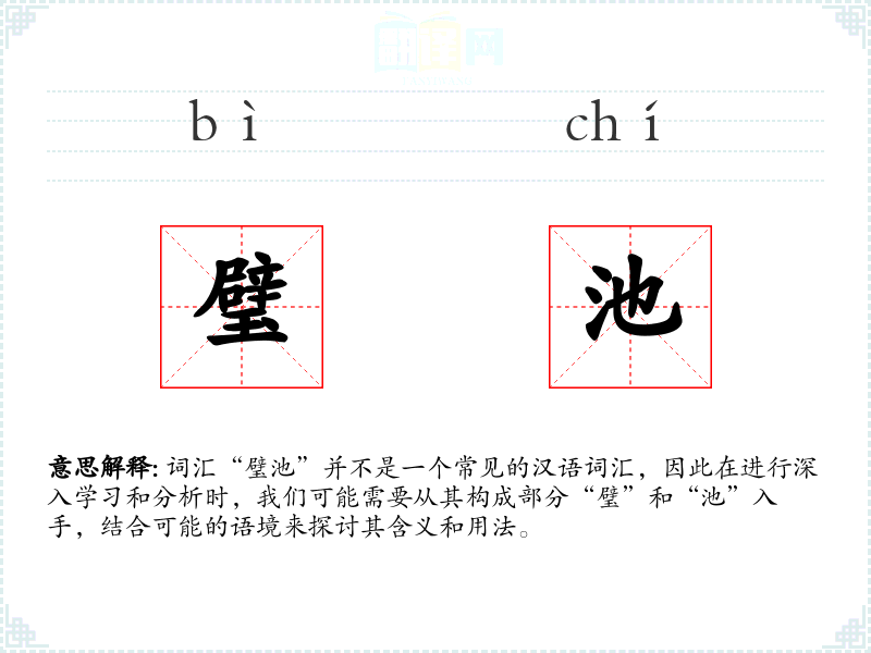 词汇“璧池”并不是一个常见的汉语词汇,因此在进行深入学*和分析时,我们可能需要从其构成部分“璧”和“池”入手,结合可能的语境来探讨其含义和用法。