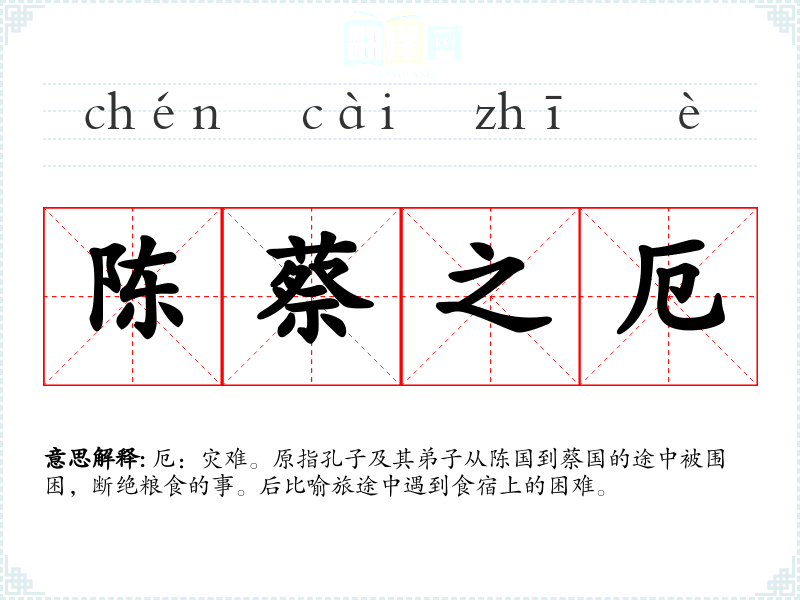 厄:灾难。原指孔子及其弟子从陈国到蔡国的途中被围困,断绝粮食的事。后比喻旅途中遇到食宿上的困难。