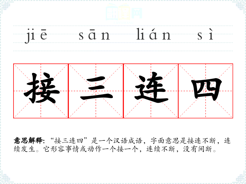 “接三连四”是一个汉语成语,字面意思是接连不断,连续发生。它形容事情或动作一个接一个,连续不断,没有间断。