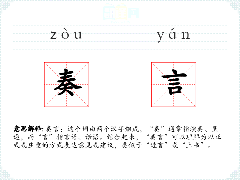奏言:这个词由两个汉字组成,“奏”通常指演奏、呈递,而“言”指言语、话语。结合起来,“奏言”可以理解为以正式或庄重的方式表达意见或建议,类似于“进言”或“上书”。