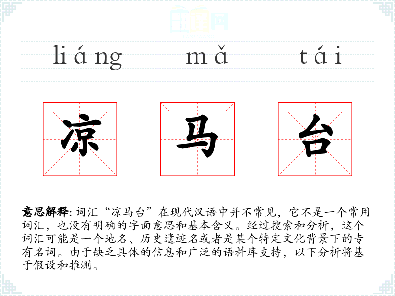 词汇“凉马台”在现代汉语中并不常见,它不是一个常用词汇,也没有明确的字面意思和基本含义。经过搜索和分析,这个词汇可能是一个地名、历史遗迹名或者是某个特定文化背景下的专有名词。由于缺乏具体的信息和广泛的语料库支持,以下分析将基于假设和推测。
