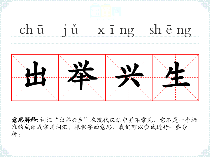 词汇“出举兴生”在现代汉语中并不常见,它不是一个标准的成语或常用词汇。根据字面意思,我们可以尝试进行一些分析: