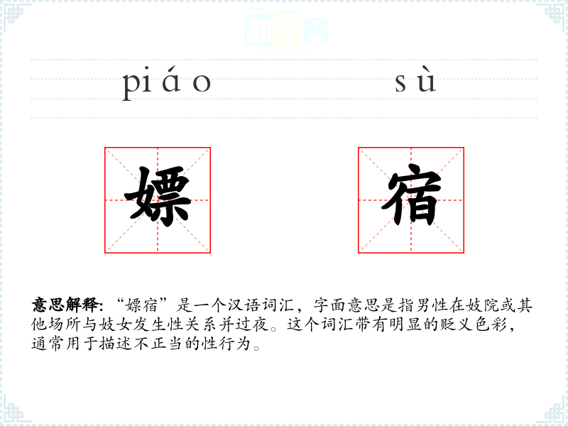 “嫖宿”是一个汉语词汇,字面意思是指男性在妓院或其他场所与妓女发生性关系并过夜。这个词汇带有明显的贬义色彩,通常用于描述不正当的性行为。