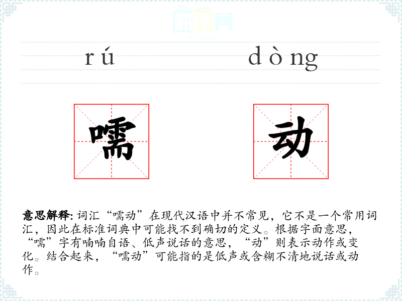 词汇“嚅动”在现代汉语中并不常见,它不是一个常用词汇,因此在标准词典中可能找不到确切的定义。根据字面意思,“嚅”字有喃喃自语、低声说话的意思,“动”则表示动作或变化。结合起来,“嚅动”可能指的是低声或含糊不清地说话或动作。