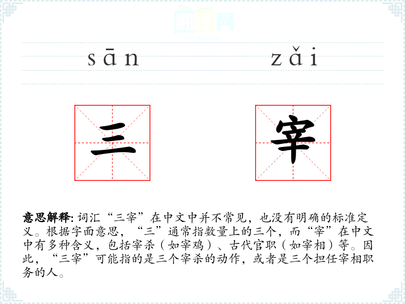 - 词源:“宰”字源于古代官职,“三”表示数量。
