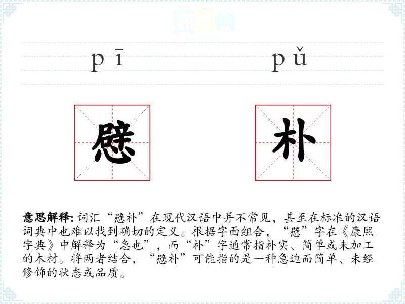 词汇“憵朴”在现代汉语中并不常见,甚至在标准的汉语词典中也难以找到确切的定义。根据字面组合,“憵”字在《康熙字典》中解释为“急也”,而“朴”字通常指朴实、简单或未加工的木材。将两者结合,“憵朴”可能指的是一种急迫而简单、未经修饰的状态或品质。