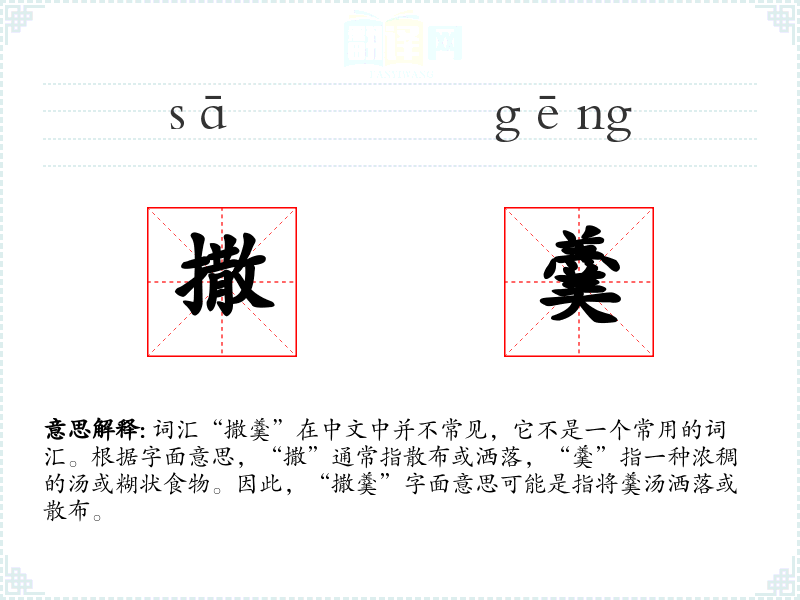 词汇“撒羹”在中文中并不常见,它不是一个常用的词汇。根据字面意思,“撒”通常指散布或洒落,“羹”指一种浓稠的汤或糊状食物。因此,“撒羹”字面意思可能是指将羹汤洒落或散布。