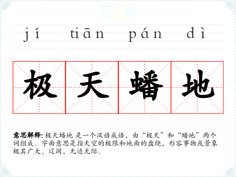 极天蟠地 是一个汉语成语,由“极天”和“蟠地”两个词组成。字面意思是指天空的极限和地面的盘绕,形容事物或景象极其广大、辽阔,无边无际。