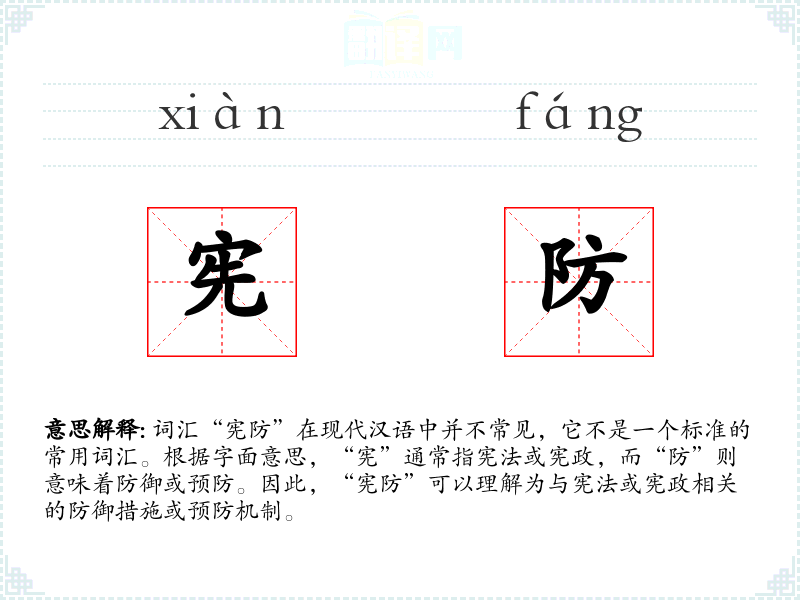 - 词源:结合了“宪”和“防”两个字,可能是在特定政治或法律语境下创造的词汇。