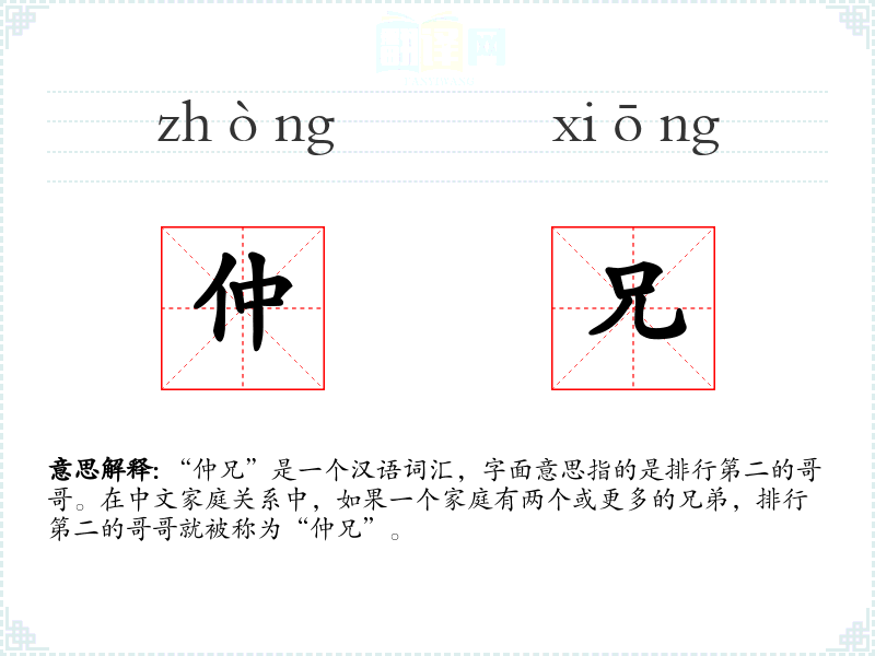 “仲兄”是一个汉语词汇,字面意思指的是排行第二的哥哥。在中文家庭关系中,如果一个家庭有两个或更多的兄弟,排行第二的哥哥就被称为“仲兄”。