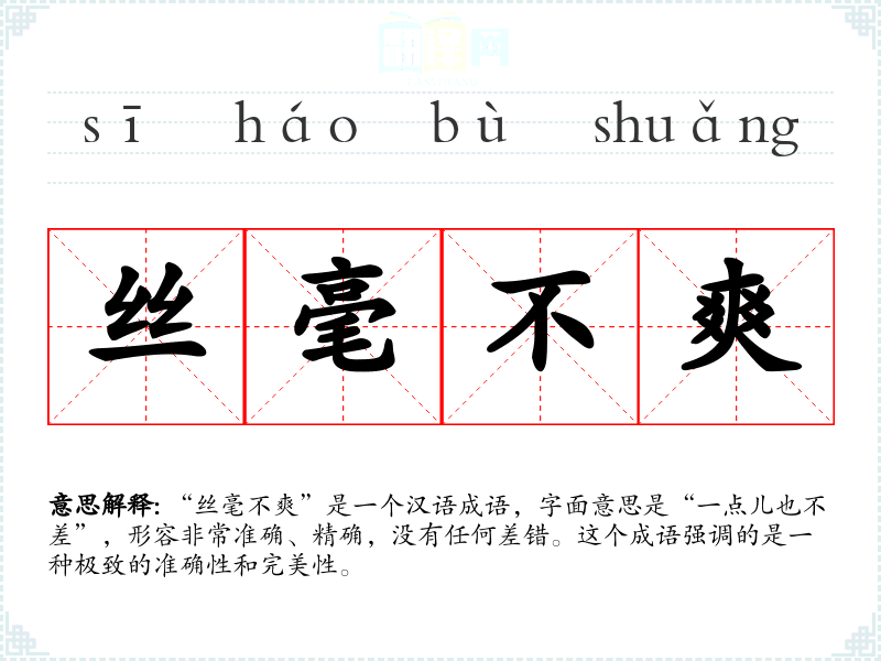 “丝毫不爽”是一个汉语成语,字面意思是“一点儿也不差”,形容非常准确、精确,没有任何差错。这个成语强调的是一种极致的准确性和完美性。