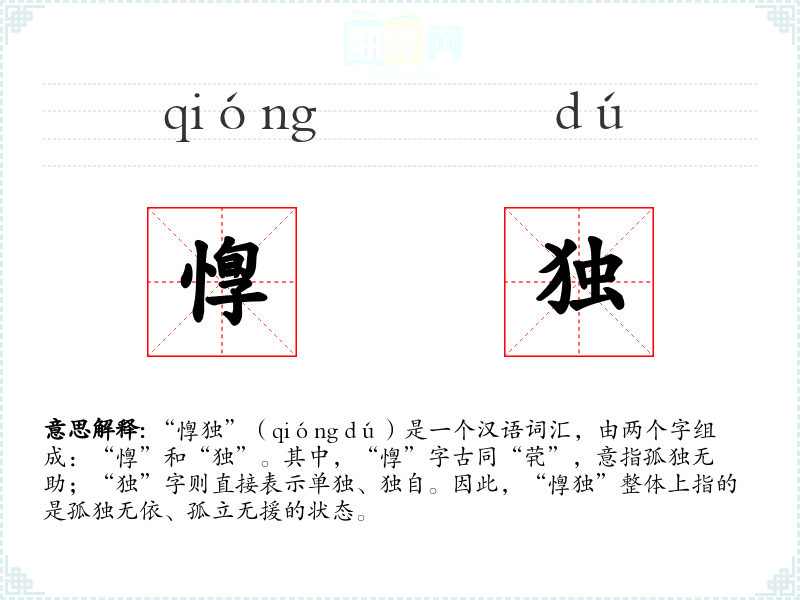 “惸独”(qióng dú)是一个汉语词汇,由两个字组成:“惸”和“独”。其中,“惸”字古同“茕”,意指孤独无助;“独”字则直接表示单独、独自。因此,“惸独”整体上指的是孤独无依、孤立无援的状态。